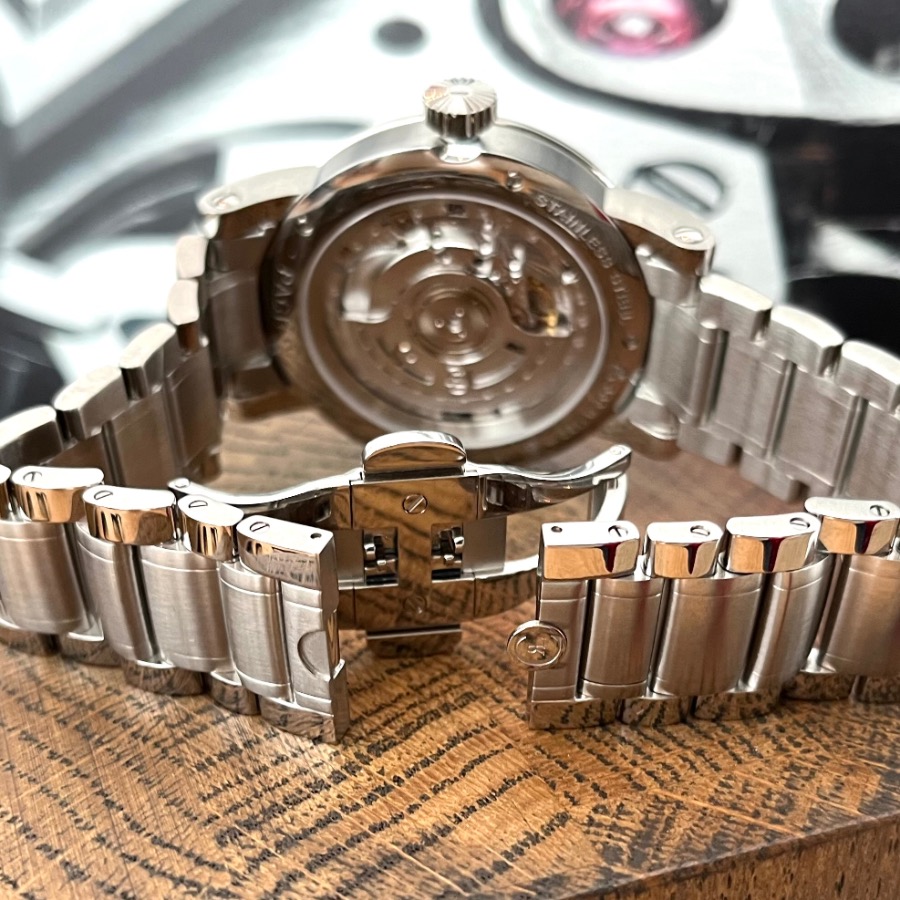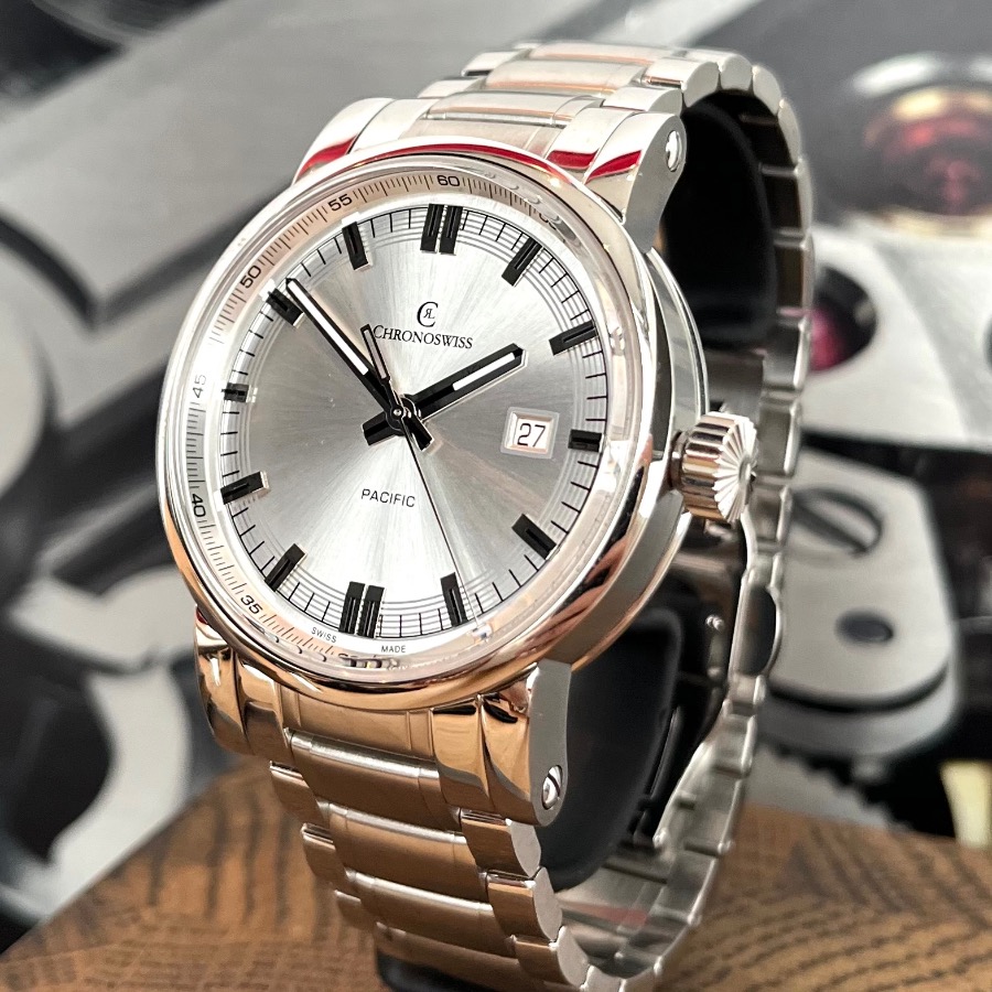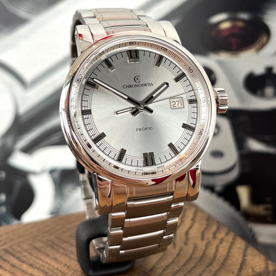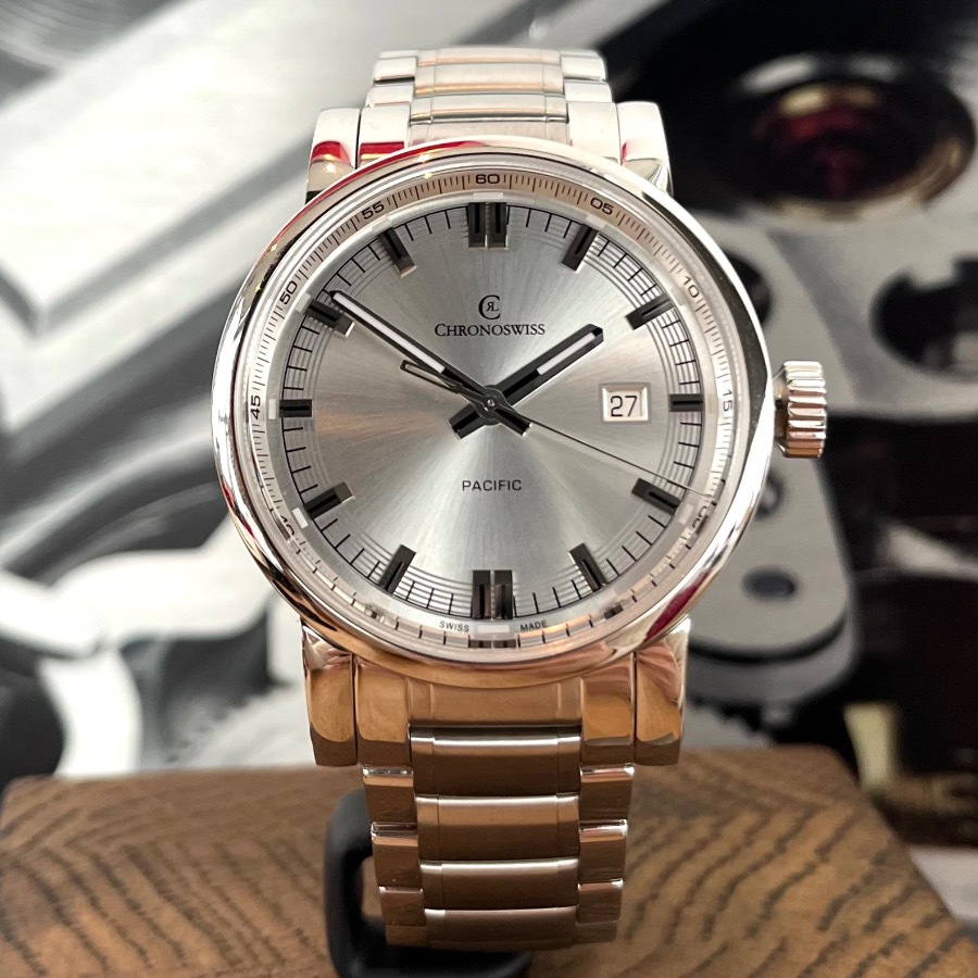Diese wunderschöne Pacific 43 ist ungetragen. Sie war ein Ausstellungsstück beim Juwelier hat daher keine Kratzer oder Swirls. Die Gangergebnisse dieser Chronoswiss sind einwandfrei.